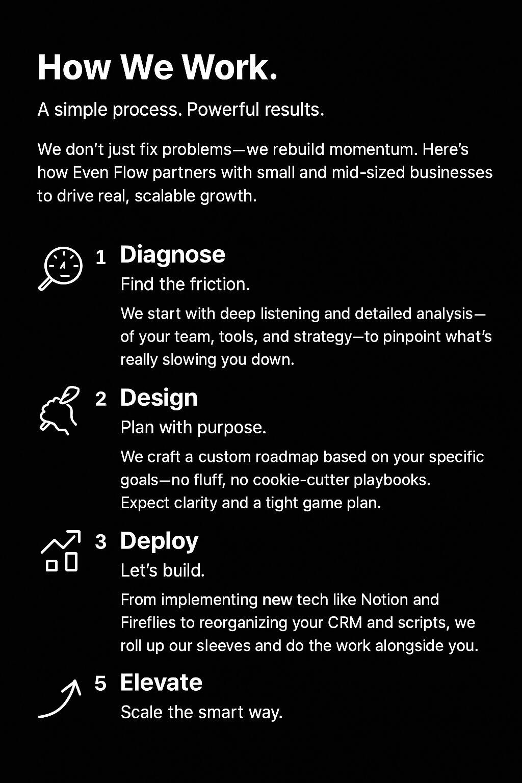 Even Flow helps small and mid-sized businesses modernize their sales and marketing systems using AI, automation, and bold leadership. Built to grow.